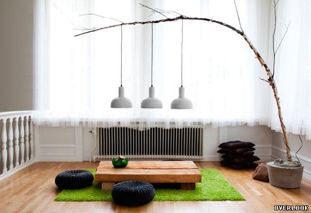 Для трех подвесных светильников, в виде опоры взята ветка березы, предварительно зацементированая в своеобразную форму для устойчивости.Остальными элементами декора "зоны отдыха" является